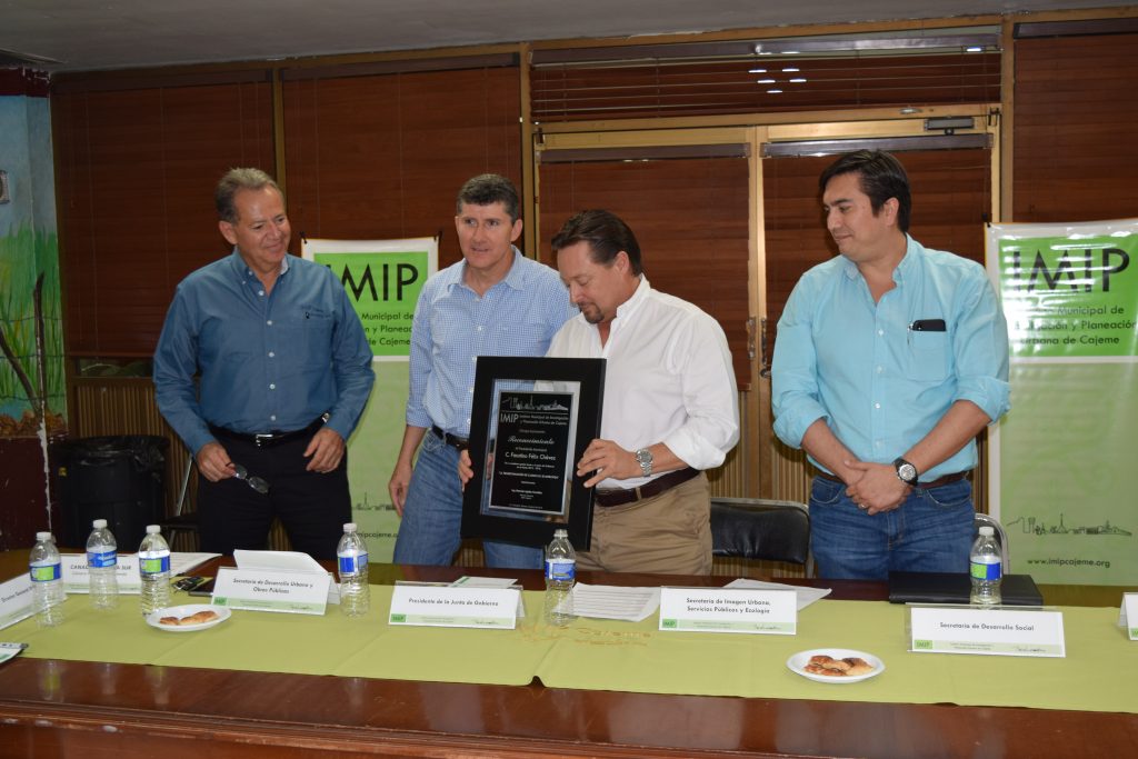 Por otra parte, a través del Consejo Consultivo se hace entrega de un Reconocimiento al Alcalde C. Faustino Félix Chávez por la importante labor al frente de la Junta de Gobierno, así mismo por su apoyo y participación brindado al Instituto Municipal de Investigación y Planeación Urbana de Cajeme.