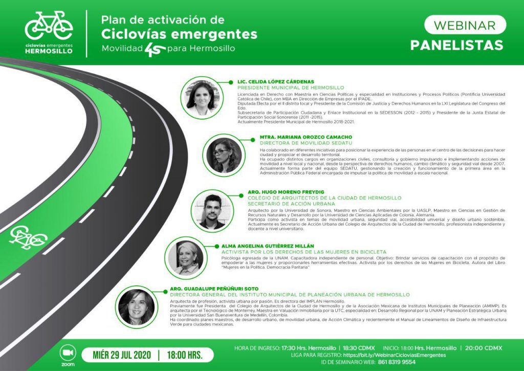 El día Miércoles 29 de Julio personal del Instituto Municipal de Investigación y Planeación Urbana de Cajeme asistió a un Webinar Sobre el Plan de Activación de Ciclovías Emergentes para Hermosillo, Sonora. En el cual participaron los siguientes Panelistas: La Presidente Municipal de Hermosillo Lic. Celida López Cárdenas, la Directora de Movilidad SEDATU Mtra. Mariana Orozco Camacho, el Secretario de Acción Urbana del Colegio de Arquitectos de la Ciudad de Hermosillo Arq. Hugo Moreno Freydig, la Activista por los Derechos de las Mujeres en Bicicleta Alma Angelina Gutiérrez Millán y la Directora General del Instituto Municipal de Planeación Urbana de Hermosillo Arq. Guadalupe Peñuñuri Soto.