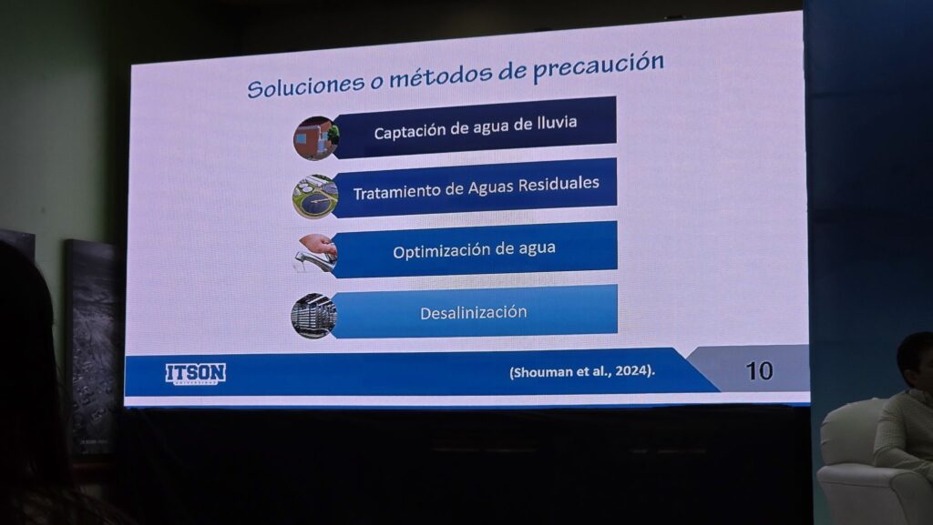 También se compartieron gráficas comparativas sobre la eficiencia física y comercial del agua en distintos municipios de Sonora, junto con los Objetivos de Desarrollo Sostenible de la ONU vinculados a esta problemática, resaltando el caso particular de Cajeme y la urgencia de tomar acción para garantizar la seguridad hídrica en el futuro.