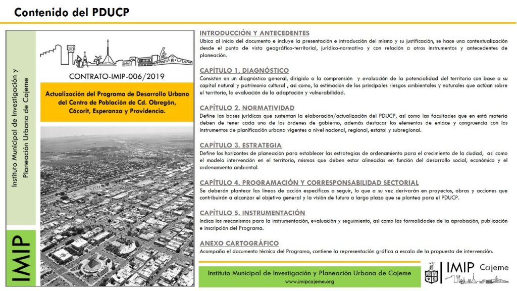 El pasado 09 de Septiembre, en el marco del Foro: Planeación Urbana y Territorial en el Siglo XXI se llevó a cabo una reunión de trabajo en el Instituto Municipal de Investigación y Planeación Urbana de Cajeme, donde se expuso la Actualización del Programa de Desarrollo Urbano del Centro de Población de Ciudad Obregón, Cócorit, Esperanza y Providencia, en los que se mostró la Jerarquía Normativa en materia de planeación del Ordenamiento Territorial y Desarrollo Urbano que hasta el momento tiene el Municipio de Cajeme. La importancia de actualizar este Instrumento Normativo es la de cumplir con la Ley General de Asentamientos Humanos y Ordenamiento Territorial y Desarrollo Urbano, además de que el Municipio de Cajeme cuenta con Programa de Desarrollo Urbano vigente que fue publicado en el Boletín del Gobierno del Estado de Sonora con fecha del 11 de septiembre del año 2000 teniendo una antigüedad de 20 años, por lo cual se considera de orden prioritario la actualización de este instrumento de planeación para que responda a los problemas actuales que enfrenta el municipio debido a los cambios demográficos, sociales, económicos y políticos que ponen en desequilibrio los centros urbanos.